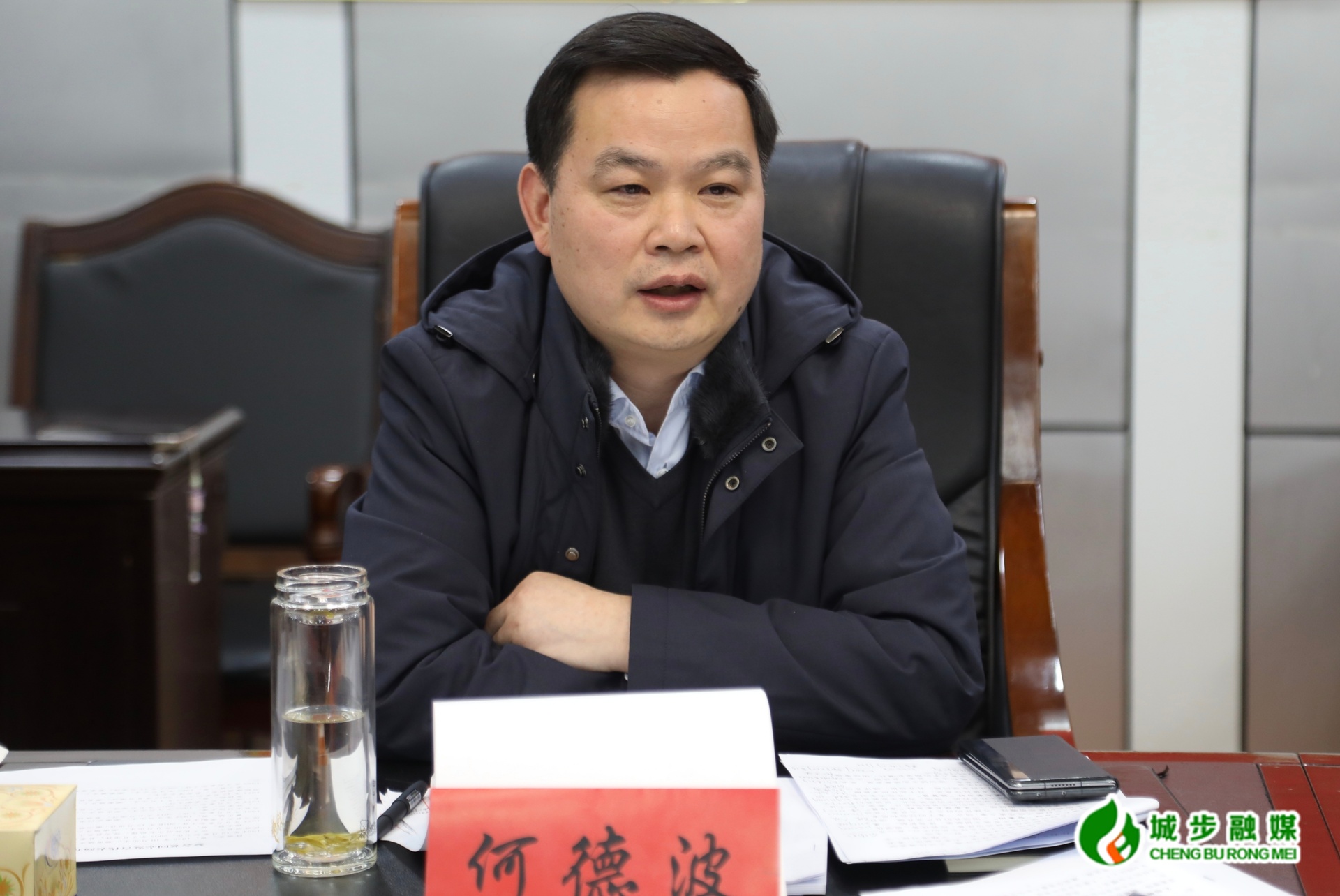 图为县委书记何德波在会上讲话
