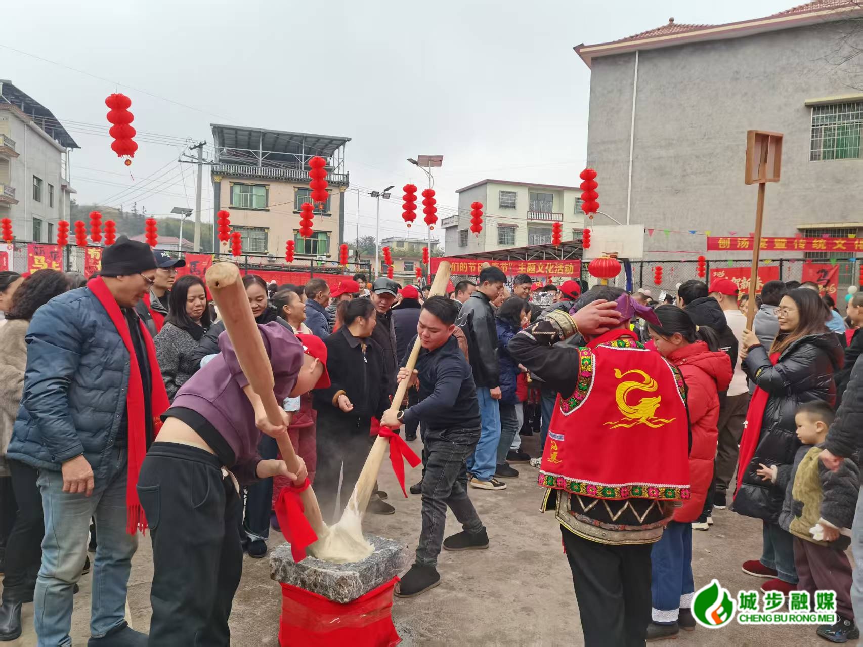 手工脆爆米花的焦香漫溢全场,打鼓乐队激情演奏,亢奋旋律激荡人心,小朋友旗队手擎彩旗分列主道两旁,苗族迎宾歌婉转嘹亮,热情迎接各界嘉宾与乡邻。手工糍粑制作区最为热闹,40斤糯米经村民轮番捶打,大家分工协作、互帮互助,在体验传统手艺的同时,感悟团团圆圆的民俗寓意。