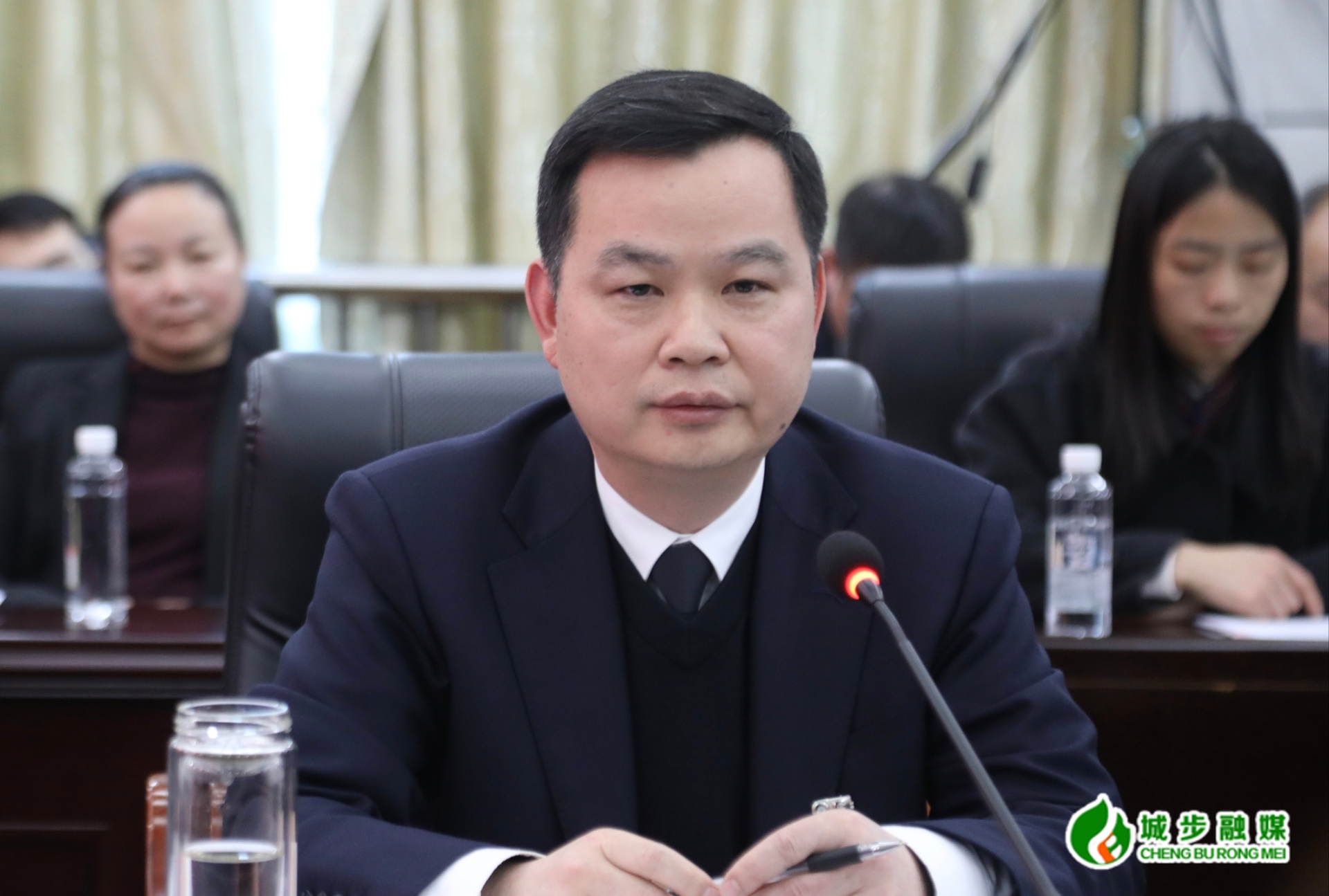 图为县委书记何德波在第一联组会议上讲话
