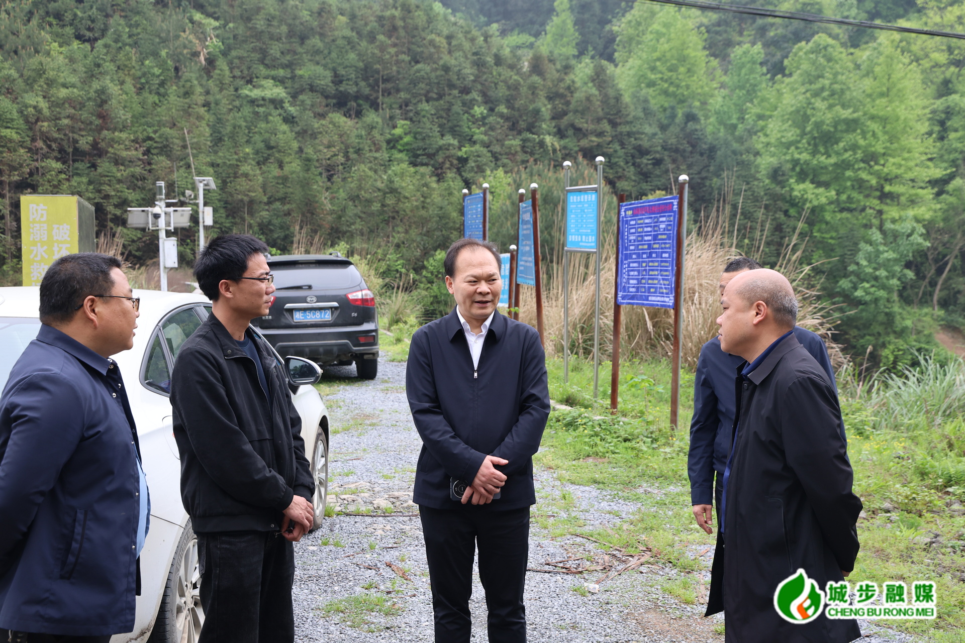 图为唐承威到蒋坊乡牛角冲水库督导防汛备汛工作开展情况