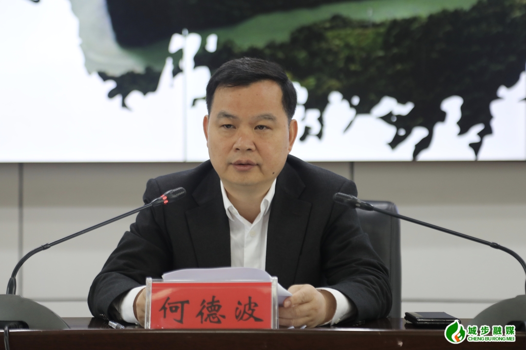 图为县委书记何德波主持会议并讲话