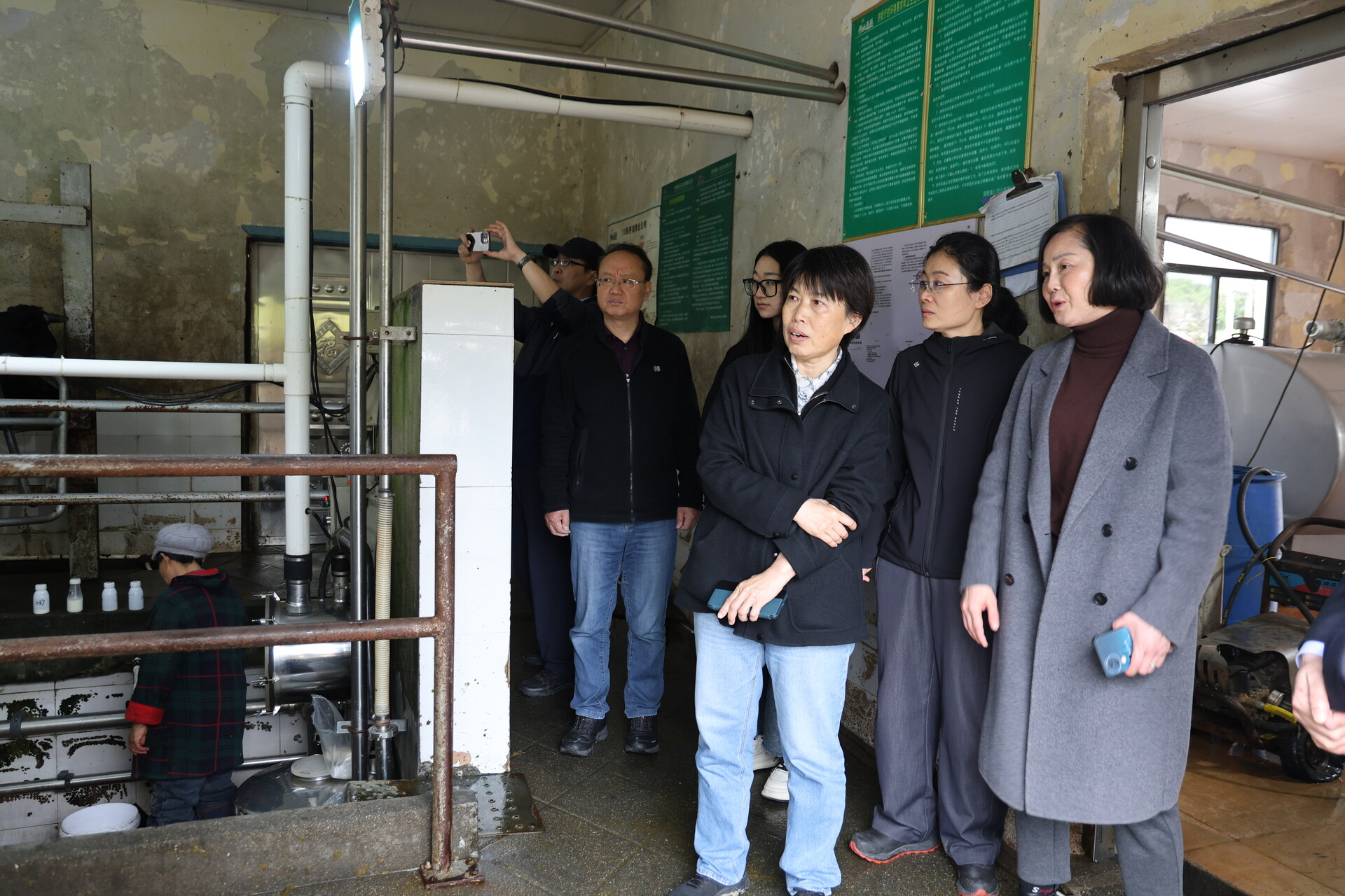 图为李淑新一行在鸡爪坪挤奶站调研