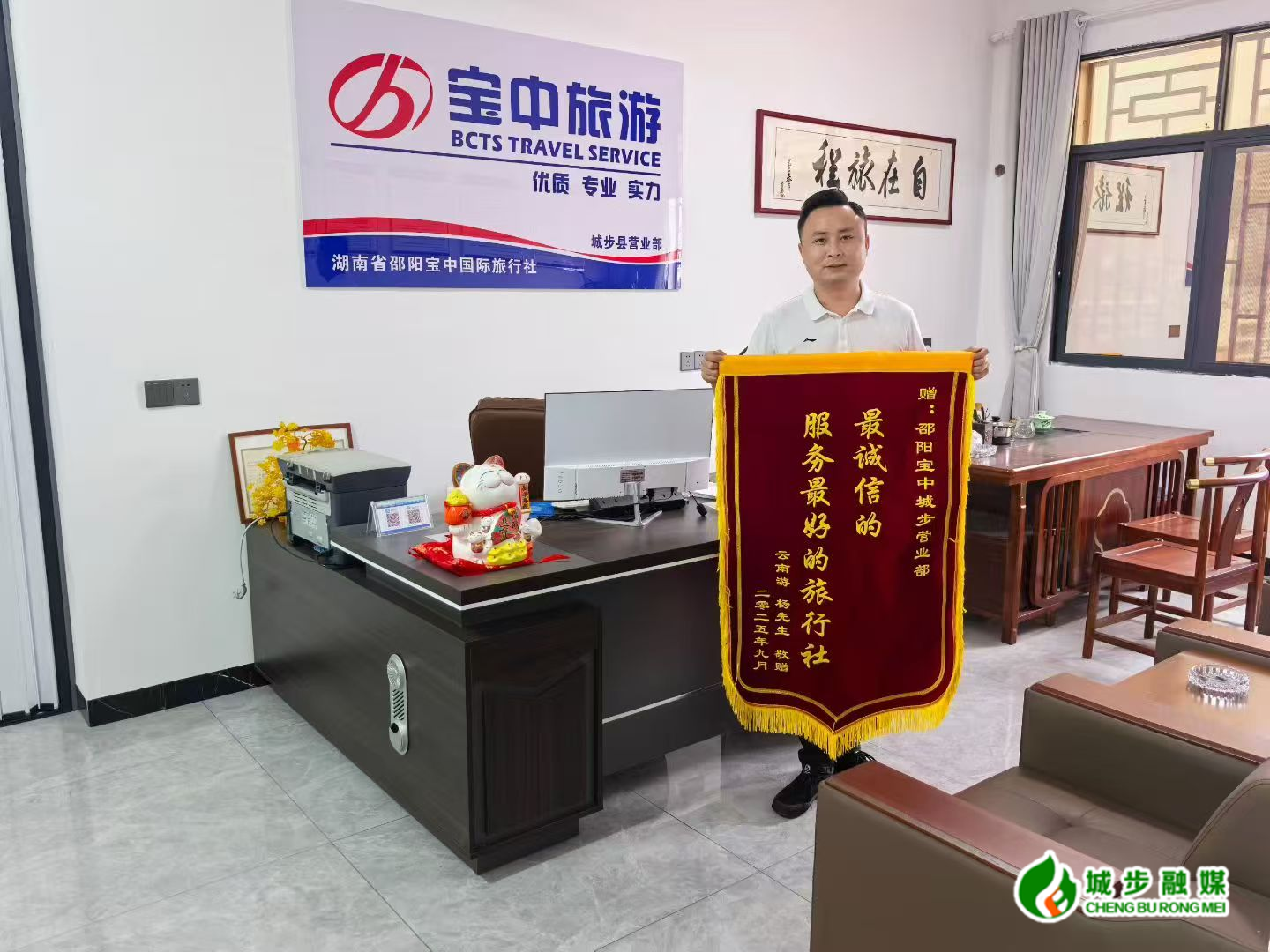 城步新闻网10月17日讯(通讯员 张佳乐 李竞婧)近日,城步旅游协会向城步文化旅游广电体育局报喜:宝中旅游城步营业部负责人王大理获得游客专程赠予的印有“最诚信的服务 最好的旅行社”字样的锦旗。这面沉甸甸的锦旗,不仅是游客对宝中旅游城步营业部旅游服务的认可,更是对城步文旅广体局长期以来深耕旅游服务质量提升和整治“导游乱象强制消费”民生实事工作的生动注脚。