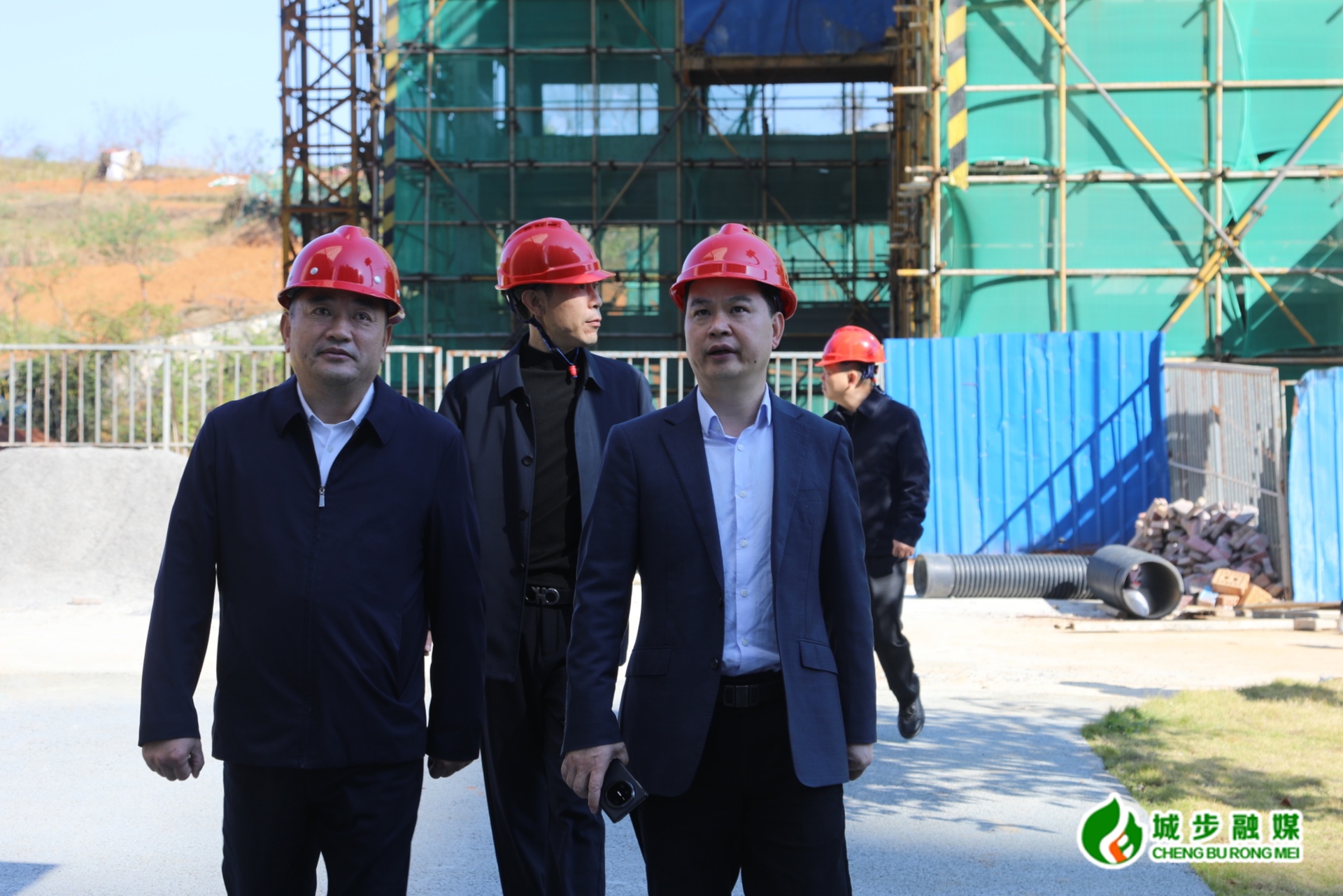 图为县委书记何德波一行在项目施工现场督导安全生产工作