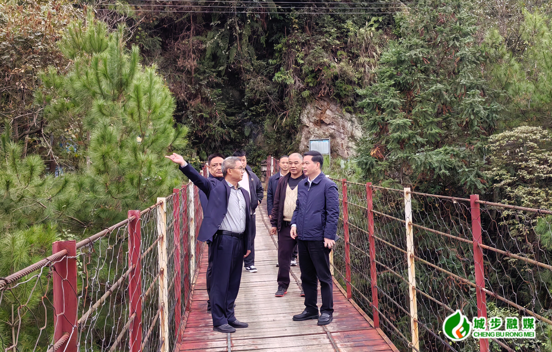 图为县委书记何德波在白毛坪镇胜利村实地查看吊桥现状