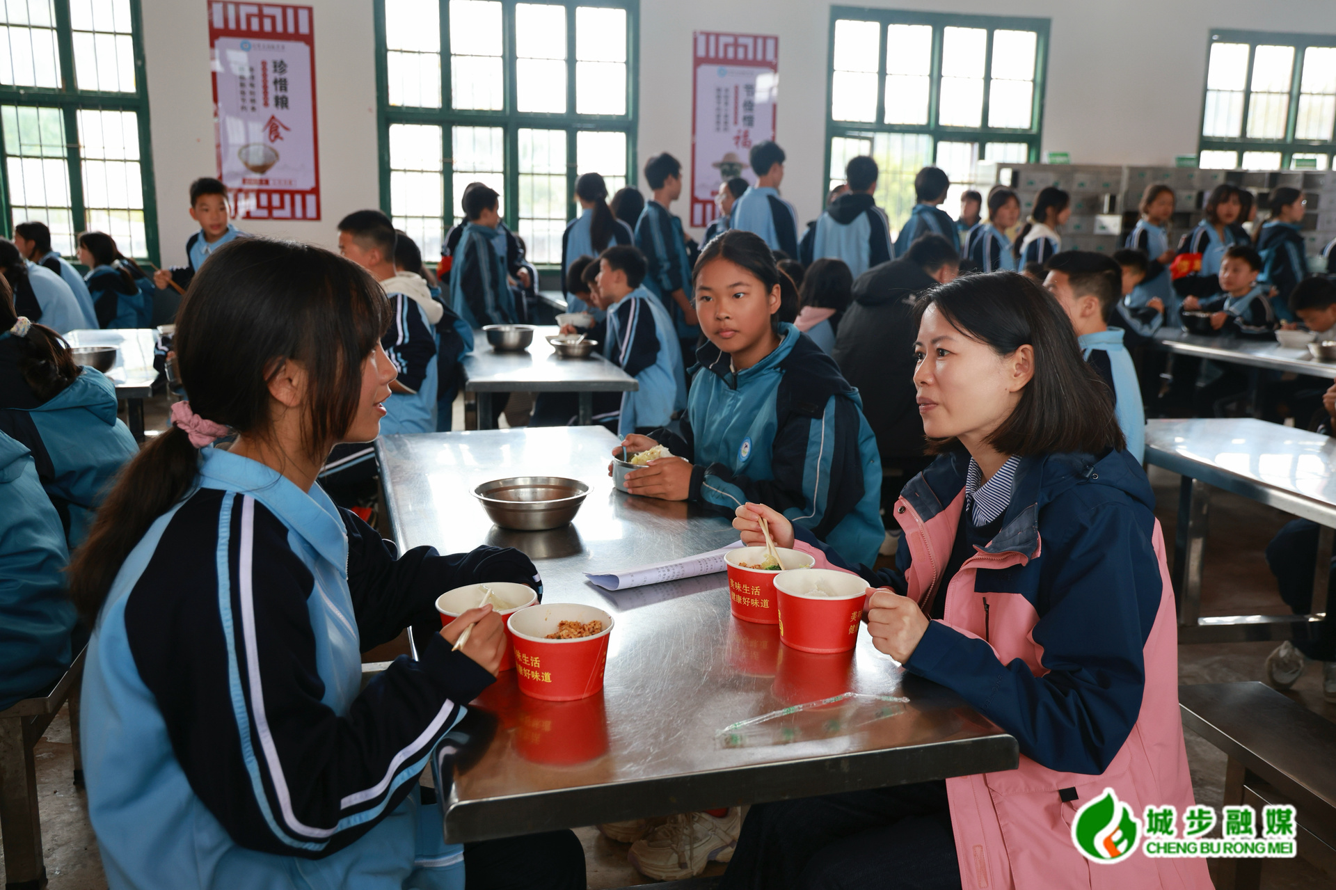 图为县委副书记、县长王慧敏在汀坪中学与学生一同用餐