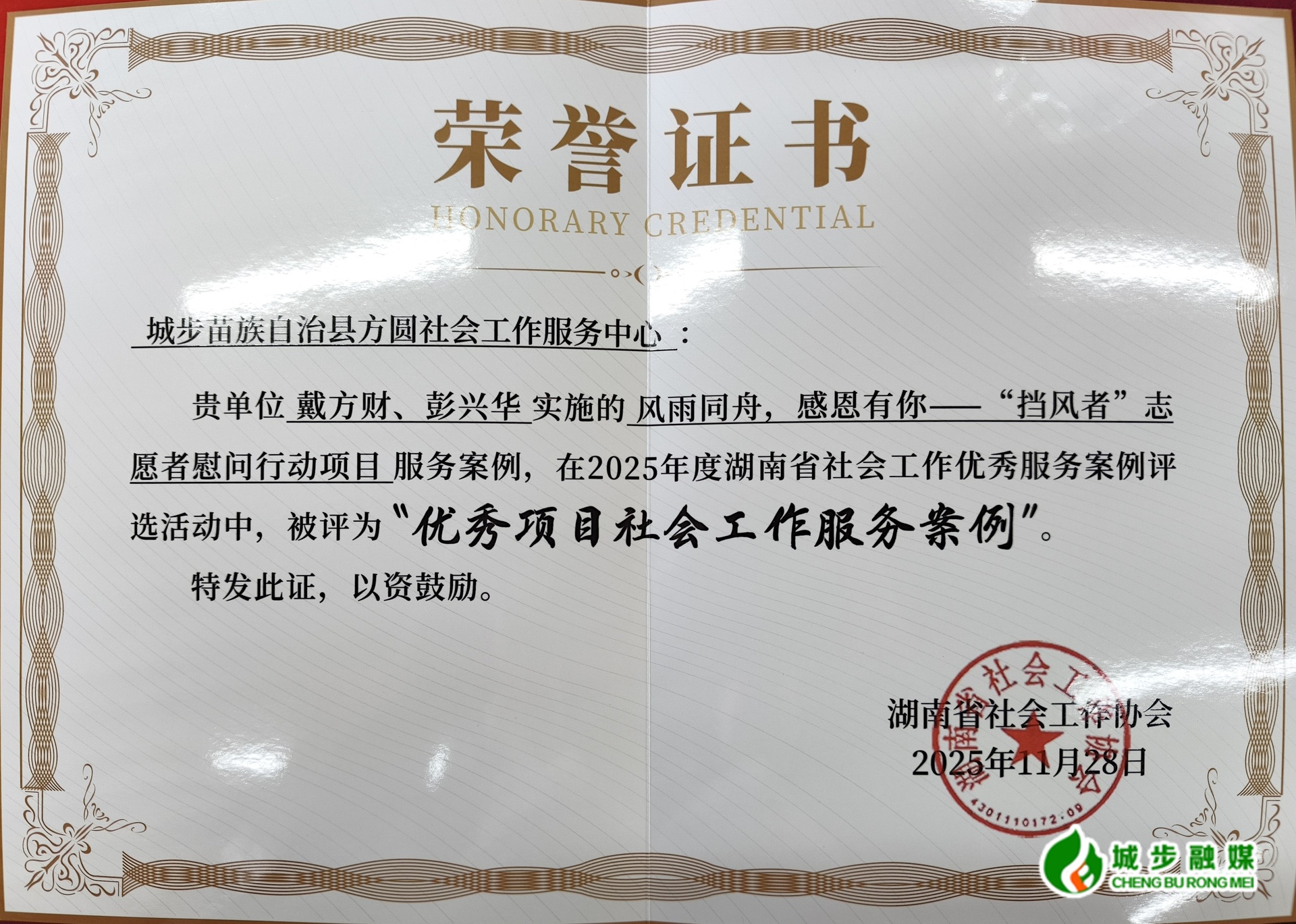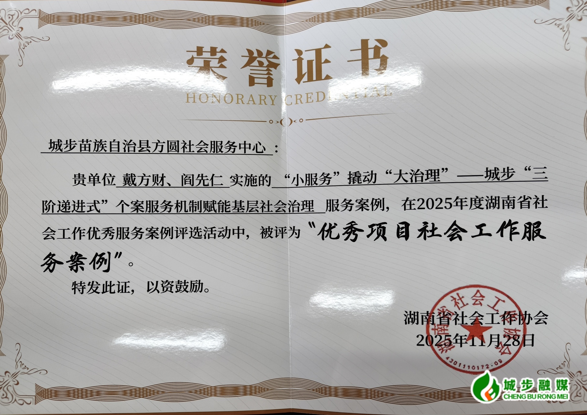 城步新闻网12月3日讯(通讯员 戴方财 彭兴华)近日,在2025年度湖南省社会工作协会第三届理事会第二次会议暨“融合与创新:社会工作与志愿服务协同发展”学术研讨会上,城步苗族自治县方圆社会工作服务中心报送的“小服务撬动大治理”三阶递进式个案服务机制和“挡风者”志愿者慰问行动两个项目,均荣获“优秀项目社会工作服务案例”称号,展现了邵阳地区社会工作专业化、品牌化发展的新成果。